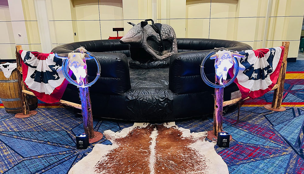 Our 12ft high x 20ft hand painted canvas backdrop will set the atmosphere for your Mechanical Bull